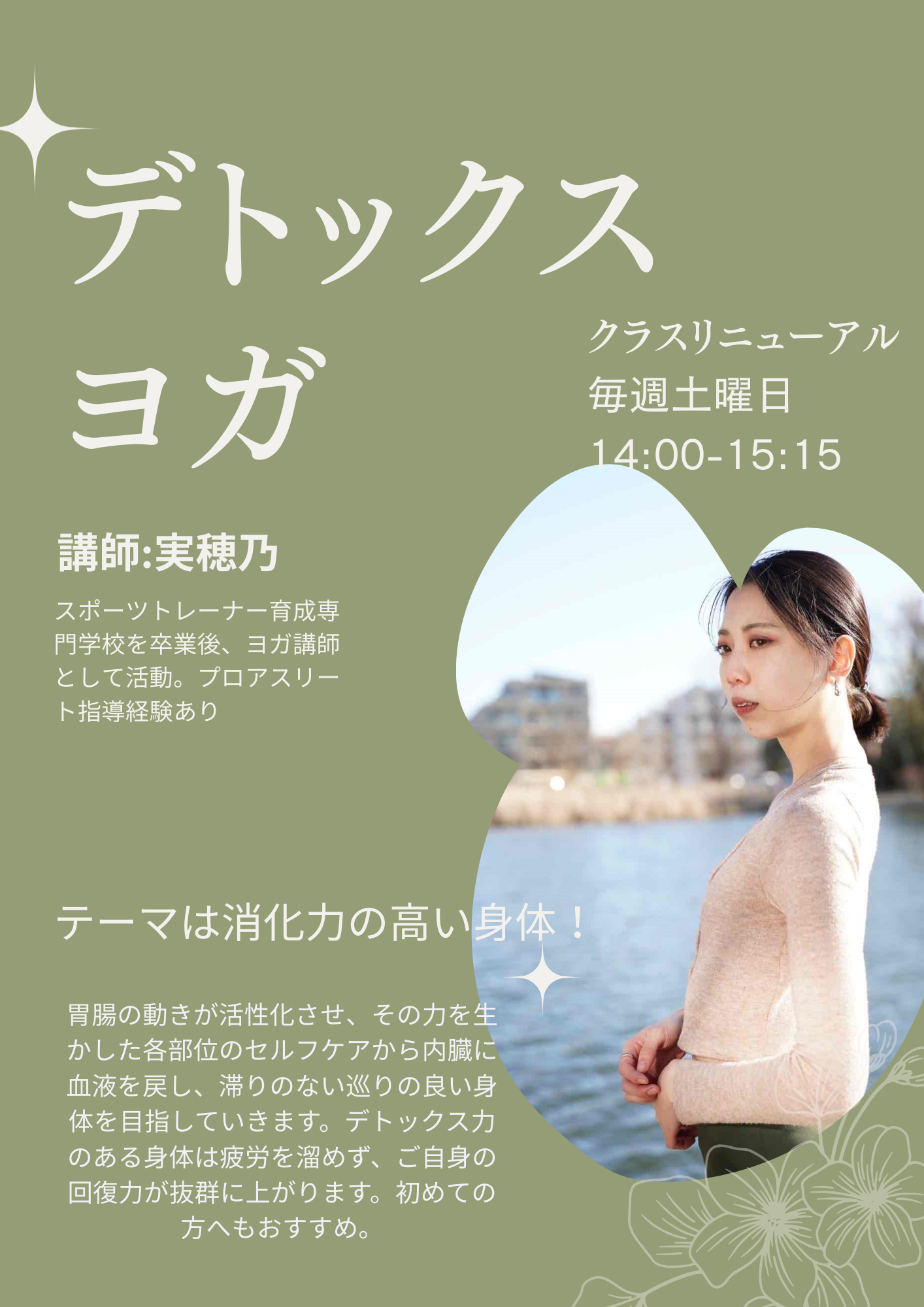 毎週土曜日14:00~15:15 デトックスヨガlevel2 実穂乃