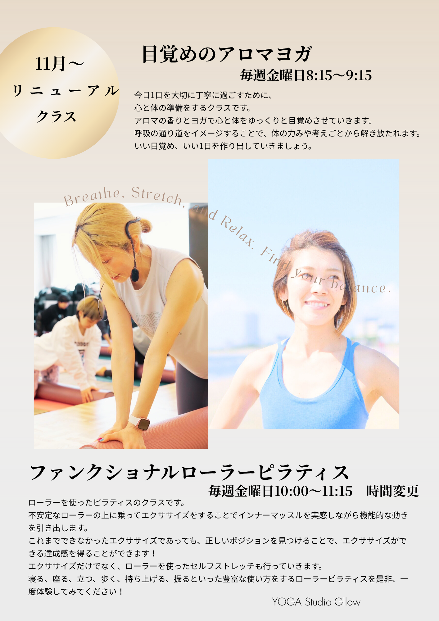2025-11-06 【自由が丘店】11月スケジュールのお知らせ こんにちは! Yoga studio gllow自由が丘店です。 ひんやり感じる日が増えて参りました。 身体を温める、血流を巡らせる、冷え対策に ぜひスタジオへ足を運んでみてください😘 床暖房のきいたスタジオでゆったりヨガをしませんか。 さて、11月も祝日に特別クラスを設定いたしました。 また、11月よりリニューアルクラスも始まっております NEWクラスもご紹介!! みなさんぜひご参加おまちしております😊
